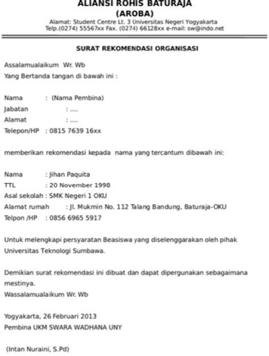 Berikut ini adalah contoh surat rekomendasi organisasi: